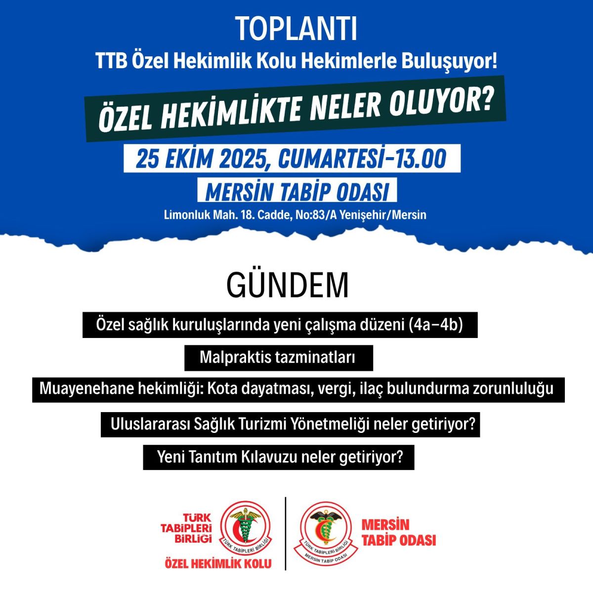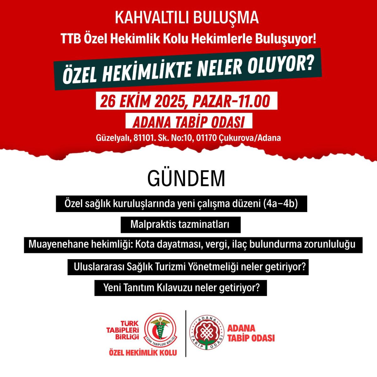 25 Ekim 2025 Cumartesi günü Mersin Tabip Odası’nda, 26 Ekim 2025 Pazar günü Adana Tabip Odası’nda yapılacak buluşmalarda özel sağlık kuruluşlarındaki yeni çalışma düzeni, malpraktis tazminatları, muayenehane hekimliği, Uluslararası Sağlık Turizmi Yönetmeliği ve Yeni Tanıtım Kılavuzu konuşulacak.