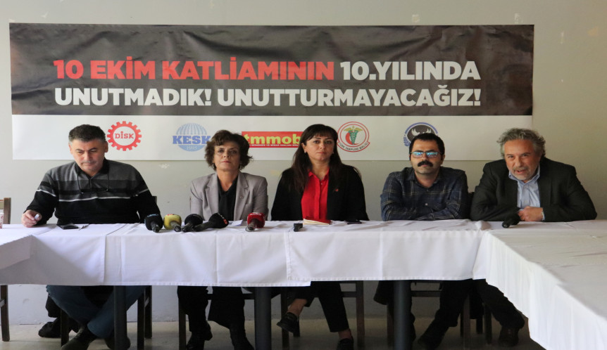 Türkiye Devrimci İşçi Sendikaları Konfederasyonu (DİSK), Kamu Emekçileri Sendikaları Konfederasyonu (KESK), Türk Mühendis ve Mimar Odaları Birliği (TMMOB), Türk Tabipleri Birliği (TTB) ve 10 Ekim Barış Derneği, 10 Ekim 2015 tarihinde Ankara’da düzenlenen Emek, Barış ve Demokrasi Mitingi’ne yönelik bombalı saldırının 10’uncu yıl dönümünde gerçekleştirilecek anma programını düzenlenen basın toplantısı ile duyurdu.