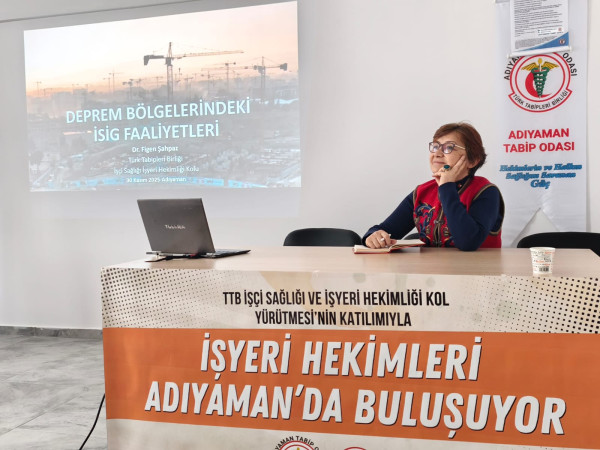Buluşmanın ikinci gününde ise Adıyaman Tabip Odası’nın yeni binasında bir araya gelindi. Toplantıya Adıyaman Tabip Odası yönetimi ve aktivistleri; Adıyaman, Diyarbakır ve Mardin’den işyeri hekimleri; Kamu Emekçileri Sendikaları Konfederasyonu, Türk Mühendis ve Mimar Odaları Birliği, Eğitim ve Bilim Emekçileri Sendikası, İnsan Hakları Derneği ve Aile Hekimliği Derneği temsilcileri katıldı. Deprem sonrası artan inşaat faaliyetleri nedeniyle il genelinde yaşanan hava kirliliği ve iş kazaları ile işçi sağlığı ve iş güvenliği sorunlarının ele alındığı toplantıda “Deprem Bölgelerinde İşçi Sağlığı ve İş Güvenliği Faaliyetleri”, “Deprem Bölgelerinde Sendikalar ve Kitle Örgütleri Ne Yapabilir?”, “İstanbul Tabip Odası Ortak Sağlık Güvenlik Birimlerine Bağlı Çalışan İşyeri Hekimlerinin Çalışma Yaşamı” ve “Kamusal-Toplumcu İSİG Hizmet Sunum Modeli” başlıklı sunumlar paylaşıldı.