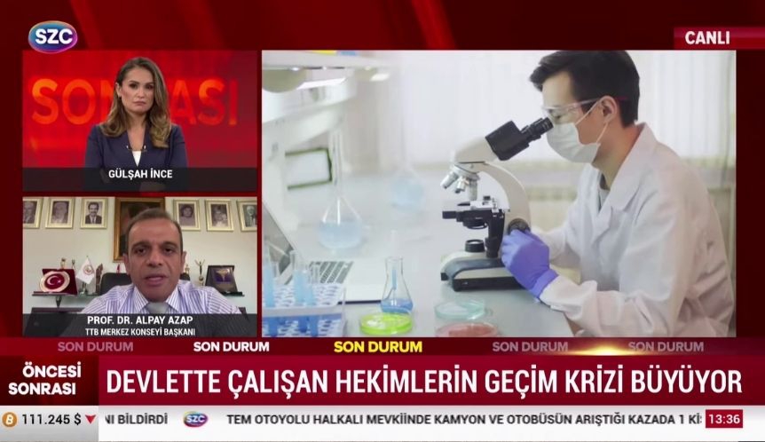 Türk Tabipleri Birliği (TTB) Merkez Konseyi Başkanı Dr. Alpay Azap, Sözcü TV’de yayımlanan “Gülşah İnce ile Öncesi Sonrası” programında hekimlerin çalışma koşullarına ve sağlık hizmetlerinin niteliğine ilişkin değerlendirmelerde bulundu.