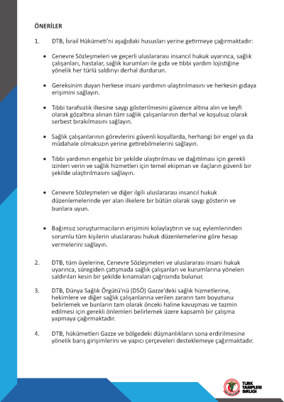 Konunun önemini dikkate alarak Genel Kurul’da özel bir Gazze oturumu düzenlendi. TTB, özel oturumda da söz alarak İsrail Tabipleri Birliği’nin sessizliğini eleştirdi ve tarafsızlık ilkesi gereğince sağlık çalışanları ve kurumlarını hedef alan saldırıları açık biçimde ve yüksek sesle kınaması gerektiğini belirtti. Ayrıca, tüm hekimleri temsil etme iddiasını taşıyan DTB’nin ortak değerlere daha sıkı sahip çıkması gerektiğini vurguladı.