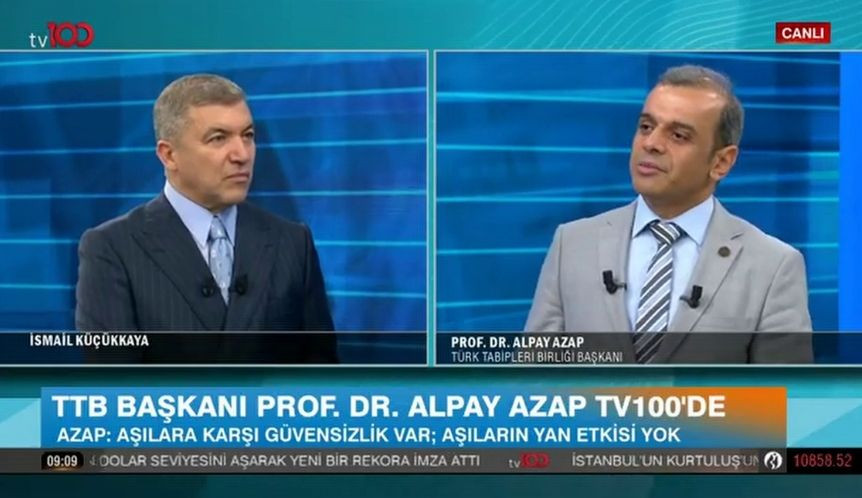 Türk Tabipleri Birliği (TTB) Merkez Konseyi Başkanı Dr. Alpay Azap, TV 100’de yayımlanan İsmail Küçükkaya ile Yenigün programının konuğu oldu. Azap, COVID-19 salgınındaki son durumu, TTB’nin önerisi ile Dünya Tabipleri Birliği (DTB) Genel Kurulu'nda gündeme gelecek Gazze’deki insani krizi ve sağlıkta şiddetin yapısal nedenleri ve tıp eğitiminde yaşanan sorunları değerlendirdi.